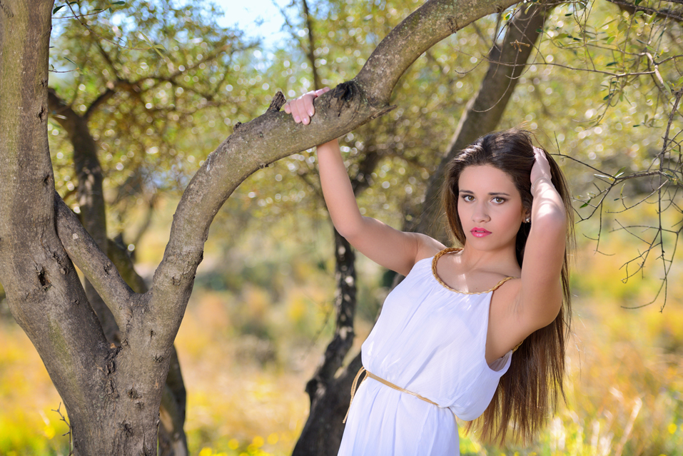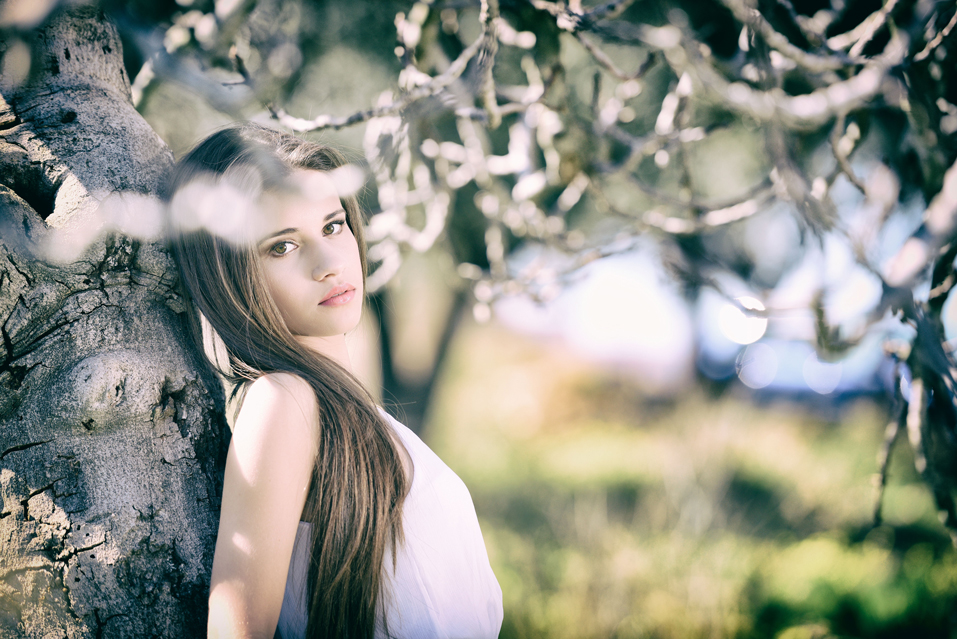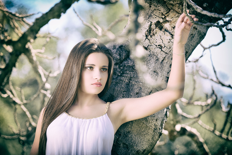 La ubicación final del rodaje fue en un bosque cerca del estudio y como el sol estaba bajo en el cielo, significaba que teníamos una luz muy agradable. Usé mi fiel softbox Lastolite como la fuente de iluminación con la lente 70-200 y un filtro ND de 3 paradas para darme la profundidad de campo que quería. Esto permitiría que yo tomara ventaja de los preciosos colores. Tomando fotografías en ambientes boscosos o de flores, realmente añade profundidad a una foto, que es por eso que siguen siendo uno de mis lugares favoritos para tomarlas.