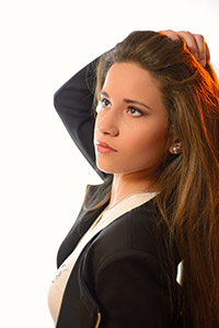 Sobre la Fotografía, comencé con cosas simples, un sencillo fondo blanco, liso, tipo Lastolite para la primera configuración de estudio. Este estaba iluminado con un flash para conseguir un bonito efecto de "High-Key". Utilicé otro flash gelificado con un filtro Honl oxidado por la luz del pelo y luego el flash principal estaba situado en un softbox Lastolite. Esa fue la configuración utilizada para la segunda foto de abajo.