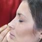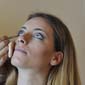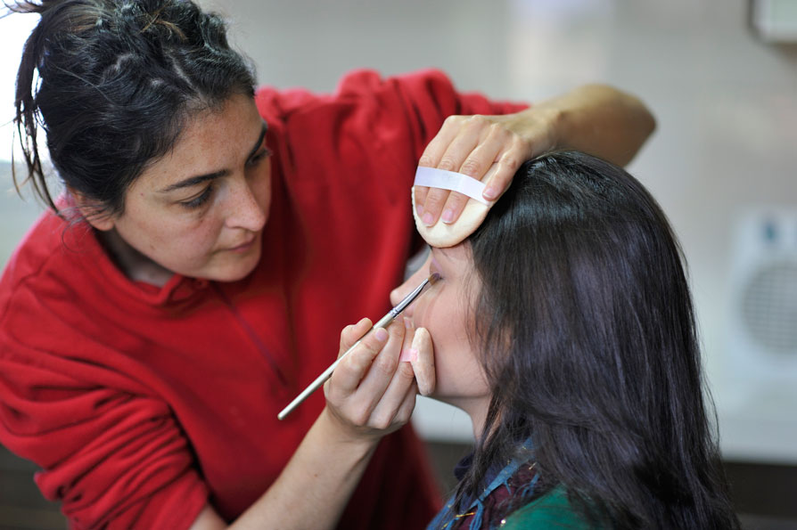 Una vez más, Sonia realizó el maquillaje profesional. Comenzó con lo que Carly deseaba: ojos oscuros y ahumados intensos. Hizo un aspecto más pronunciado en Carly hasta donde le permitió su tono de piel para que no quedara demasiado exagerado. Utilizó sombra negra y marrón alrededor de los ojos y un color rosa neutro en los labios para complementar el tono de la piel de Carly, resaltando así la intensidad de los ojos que nos dio una serie de fotos con bonitos contrastes.